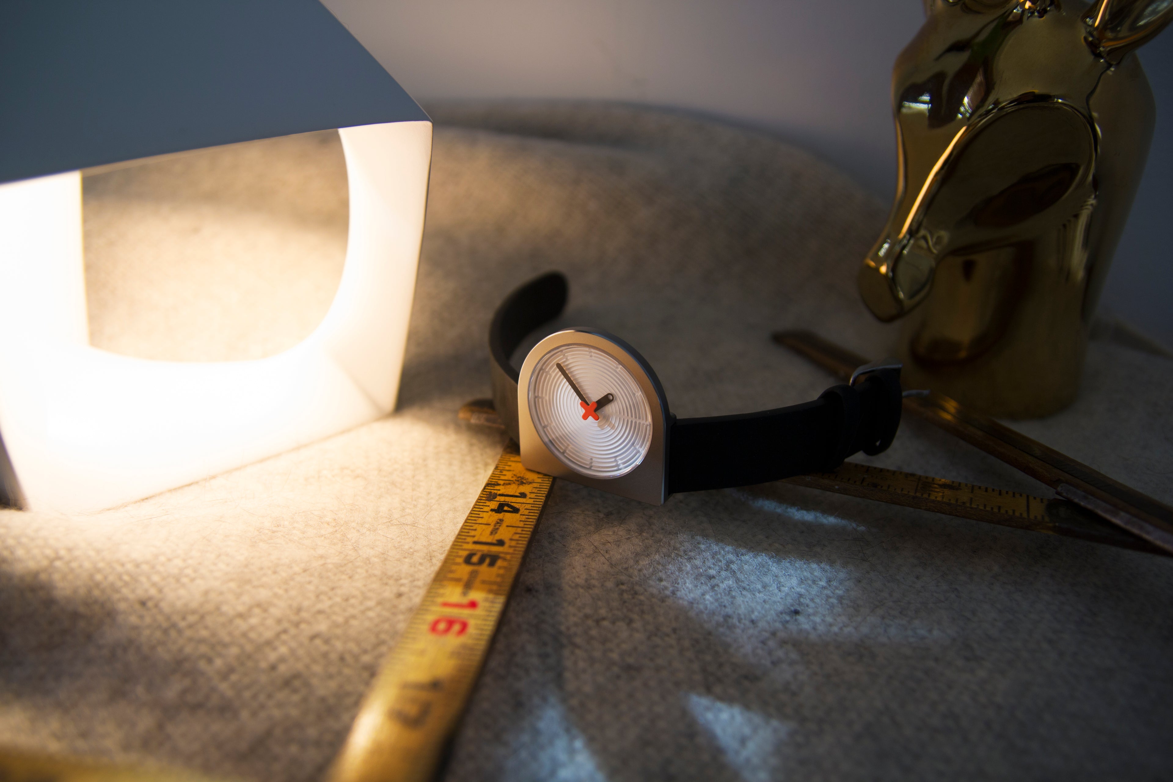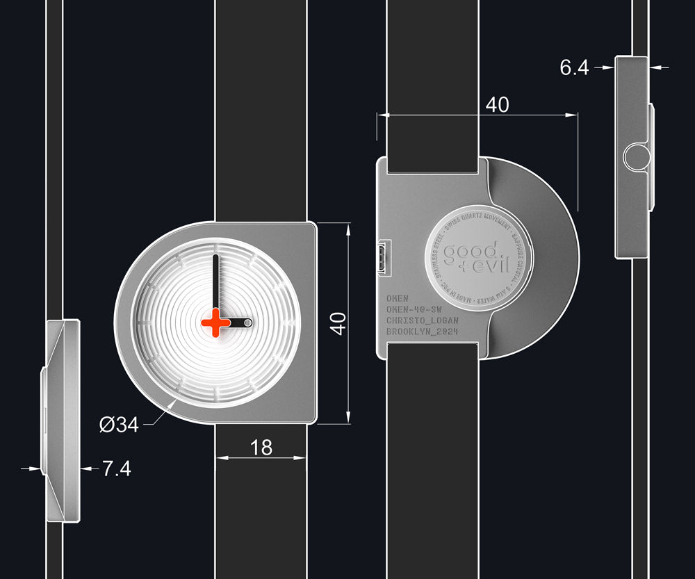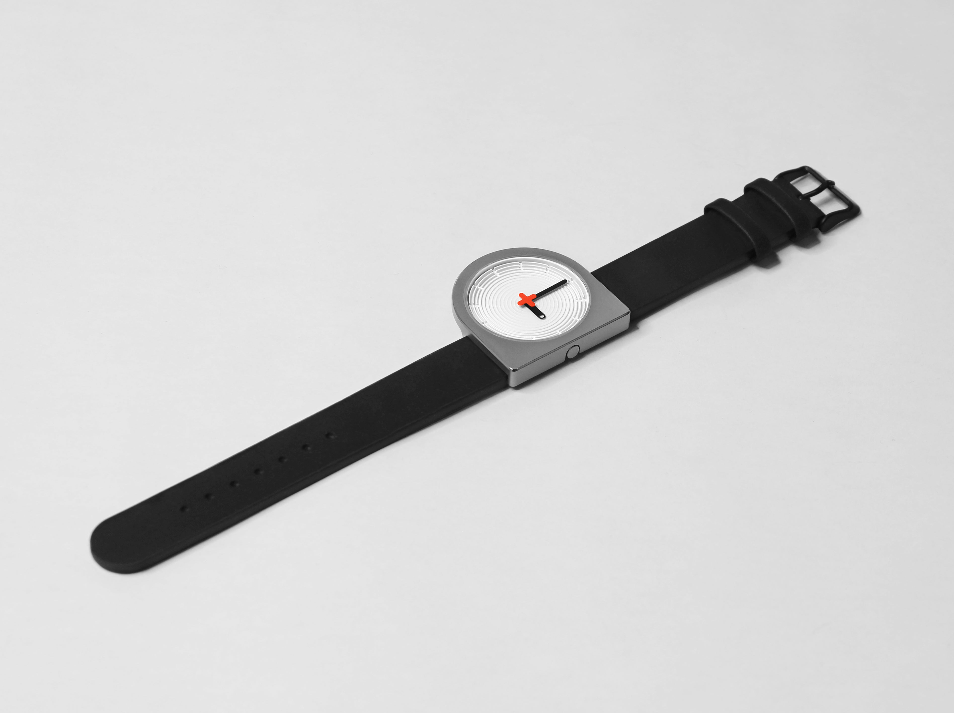 It began with the compulsion to integrate the crown flush with the stainless steel case no matter its rotation, which resulted in a flat right edge that provided an excellent opportunity to also integrate the lugs such that the left edge of the strap aligns perfectly with the center of the 3D "zen garden" dial that uses shadow and light to mark the hours, undisturbed by a vulgar logo as that has been elevated to the status of seconds hand, completing the pure result of an intense negotiation between circular and squared geometries.